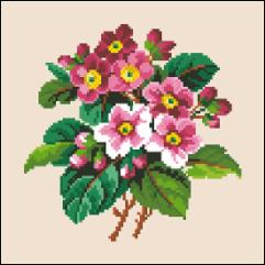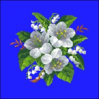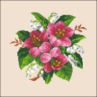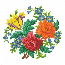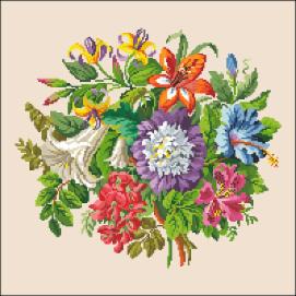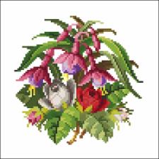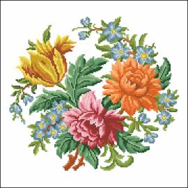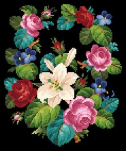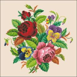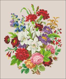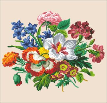 This 1840's pattern comes from the famed designers HERTZ & WEGENER in Berlin, design number 2230. The bouquet is a composite of comon and exotic flowers which makes a striking design. It is made up of 52 DMC colors, and is 269 stitches wide by 213 stitches tall.