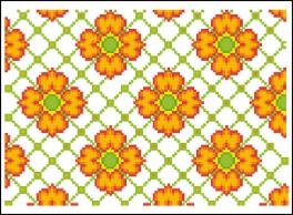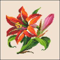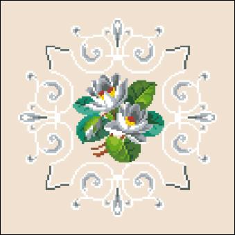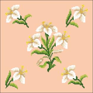 This Victorian pattern of Silkwork Lillies, comes from a finished piece in the seller's collection. Originially designed as a foostool, this pattern was executed in silk on a soft salmon wool background. Comprised of 12 DMC colors, it is 106 stitches wide by 109 stitches tall. The original finished work, had a diagonal latticework background executed in shades of blue, which I have omitted, as it would be deemed to fussy for today's tastes.