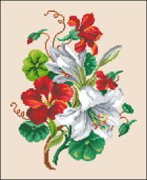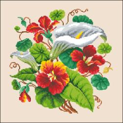 This 186'0s pattern comes from the designer Grunthals Vertag from Berlin, pattern number 6178 and is part of the seller's collection. The design centers around an oversized Arum Lilly surrounded by Nastursums and leaves. Made up of 42 DMC colors, it is 151 stitches wide by 153 stitches tall.