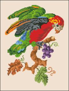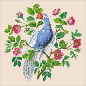 This late 1860's pattern originally comes from Liverpool England and features a Red Crested Bluebodied Foul amongst a bower of Pink Wild Roses. The design is 203 stitches wide by 203 stitches tall and is made up of 36 DMC colors.