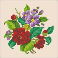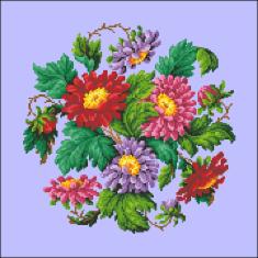 This 1870's pattern of a bouquet of Bachelor Buttons, comes from a finished work in th seller's collection. On the original design, the flowers were executed in silkwork, the flower centers in beadwork with the balance in wool. The design as shown is made up of 32 DMC colors and is 120 stitches wide by 117 stitches tall.