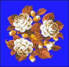 This late 1860's French pattern was a supplement from the magazine "Le Moniteur Des ames ( DDes Demoiselles." The pattern is shown with the original French Blue background with white roses and rust leaves. The design is 113 stitches wide by 109 stitches tall and is made up of 12 DMC colors.