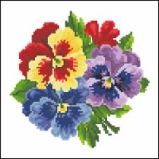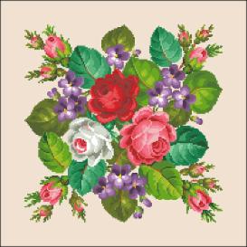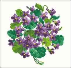 This 1860's pattern comes from a finished work in the seller's colletion. The design was executed on a laticework background in shades of gold. I have eliminated that as it appeared to busy for today's taste and diminished the beauty of the design. Originally the Violets and the white Rose was done in beadwork which made them stand out. The pattern is made up of 47 DMC colors and is 160 stitches wide by 160 stitches tall. While the original work was never used, I presume it was desgined for a chairseat or cushion front.