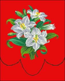 This 1860's banner screen of Lillies, comes from a finished work in the seller's collection. The original design was executed with the lillies in beadwork, the stamens in silk and the leaves in wool. I have also included the original shape of the banner outline should you want to replicate it. The design is made up of 28 DMC colors and is 153 stitches wide by 141 stitches tall.