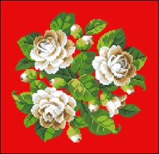 This pattern is a duplicate of the one above, but with green leaves on a red background. While the design size is the same, the number of colors has changed to 15 DMC colors, to accomodate some of the color shading that existed in the roses.