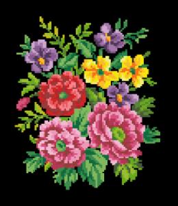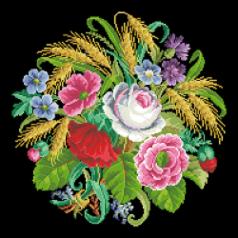 This late 1860's pattern comes from a finished work in the seller's collection that originally came from Austria. The design is a striking bouquet of Poppies and Roses intermingled with shafts of wheat and lush green leaves. Made up of 40 DMC colors and shown against the original black background of the finished work, it is 180 stitches wide by 180 stitches tall.