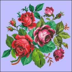 This 1860s English pattern of Red and Pink Roses comes from the seller's collection and is comprised of 26 DMC colors and is shown over the a similar blue background as the original pattern displayed. The design shown is 108 stitches wide by 108 stitches tall.