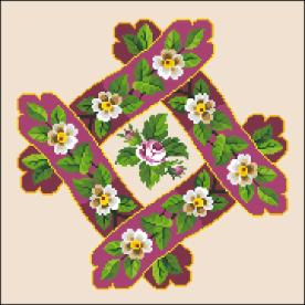 This 1860's German pattern comes from the designer A. Todt Berlin and is pattern number 5990. The design is made up of wild roses and bus and uses 34 DMC colors and is 110 stitches high by 110 stitches wide.