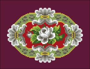 At the request of a customer the center oval was removed and made a pattern unto itself for use as a chair back. The design is 105 stitches wide by 137 stitches tall and is made up of 31 DMC colors.