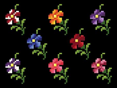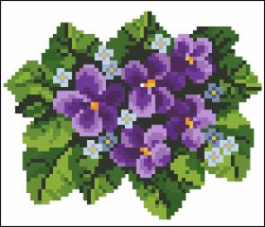 This 1860 Berlin woolwork pattern of violets is comprised of 16 DMC colors and is 68 Stitches wide by 55 Stitches tall. Originally the small blue forget me nots, were to be executed in beads.