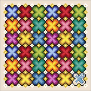 This 1870s pattern comes from a finished work in the seller's collection. Made up of 26 DMC colors that match the original design, it is 89 stitches wide by 88 stitches tall.