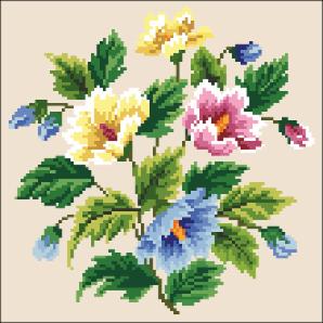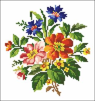 This 1868 pattern french pattern from the seller's collection is a nice arrangement of Wild Roses, Forget Me Nots and Coriopsis. Using 31 DMC colors, that closely match the original pattern, finished it is 85 stitches wide by 91 stitches tall.