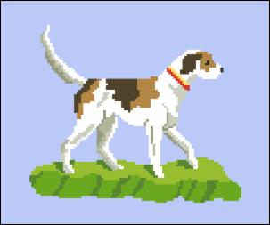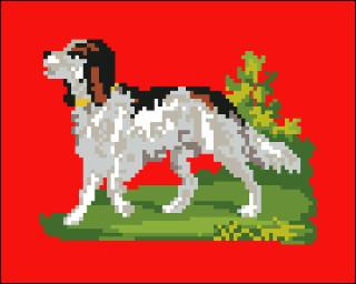 This 1860s pattern comes from a finished work in the seller's collection. The Victorian pointer, sat upon a small footstool, that like the needlework, was handmade. Made up of 14 DMC colors, it is 94 stitches wide and 79 stitches tall.
