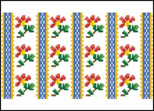 This small shelf banner comes from the seller's collection and graced the front of a child's hutch that held a prized teaset. The design shown is two repeats and can be lengthened as desired. As shown, the pattern is 101 stitches wide and 48 stitche tall, and uses 5 DMC colors that match the original work.