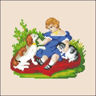 This 1850s pattern of a young girl protecting her cat from a dog comes from an original pattern in the seller's collection. It is comprised of 36 DMC colors to get all the shading of the original pattern and the design is 94 stitches wide by 76 stitches tall. While the background is show against the original color of the pattern, it would look striking against and dark brown or black background as well.