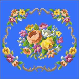 This 1860s pattern comes from a finished English work that was done in shades of beads and woolwork on a peacock blue background. Made up of 20 DMC colors that match the original finished work, the design will be 100 stitches wide by 100 stitches tall.