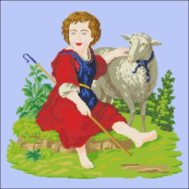 This shepherd is a copy of an 1865 finished work from the seller's collection and is made up of 55 DMC colors to obtain the original shading. It is a large pattern at 242 stiches wide by 230 stitches tall. The original needlework had the background unworked.