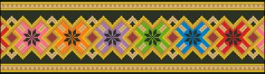 This 1860s English pattern of interlocking ribbons and rosettes, comes from a finished work in the seller's collection and is comprised of 25 DMC colors for the multi colored band and 5 DMC colors for the monochromatic band. Both patterns are sent with the order. The individual design is 41 stitches wide by 41 stitches tall for one pattern. The design shown is made up of six patterns and can be increased to any length as desisred.