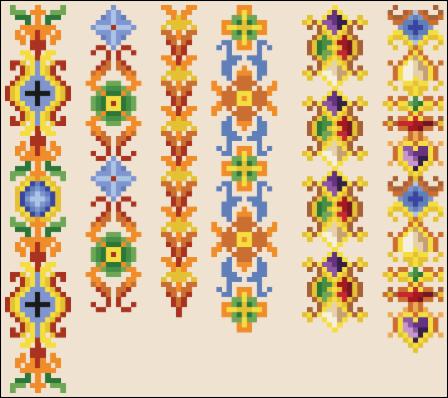 This 1860s pattern selection of borders come from the seller's collection and originated in Germany. The six patterns can be repeated to any length, and round corners as well. Comprised of 25 DMC colors overall, all the colors are used in 3 of the six patterns. The pattern group is 87 stitches wide by 77 stitches wide for 2 repeats on most of the designs.