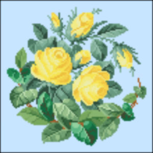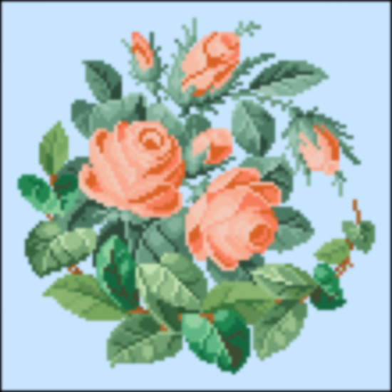 This Berlin Woolwork Pattern by Louis Gluer hails from the late 1860s as the colors are less bright and executed in muted tones. The pattern design is of an open circle of Roses and is square at 100 stitches wide by 100 stitches tall and uses 28 DMC colors. While the original pattern was in the Red Rose pallet, this pattern is replicated in the peach tones.