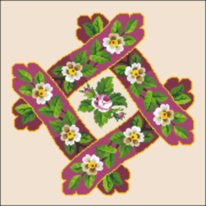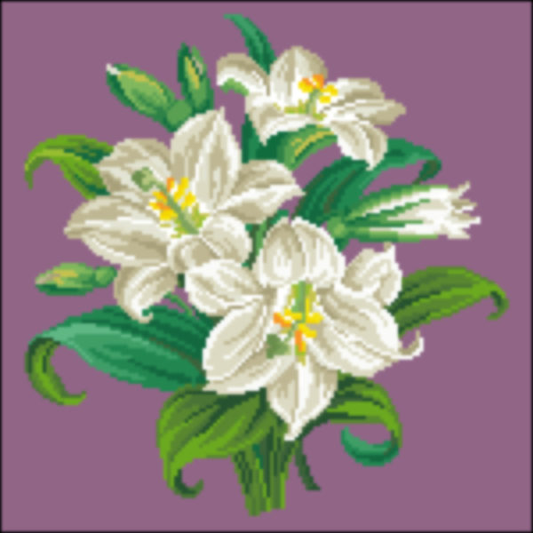 This 1860’s Berlin Work design comes from a finished work that hangs off of my fireplace. The lillies were worked entirely in shades of white beads while the leaves and background were worked in wool. The design is almost square at 136 stitches wide by 141 stitches tall and is comprised of just 28 DMC colors. The Lillies could easily be changed to shades of pink or peach. I have shown it against the original background which was a deep purple.