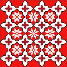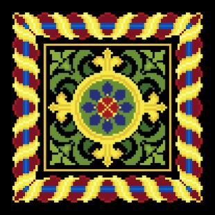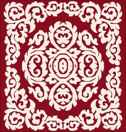 This pattern is from a period magazine dated 1873. The pattern was to be used as a cushion cover, chairseat, travelling bag or carpet runner. Made up of 8 DMC colors the pattern is 109 stitches wide and 62 stitches tall, which can be expanded in either direction.