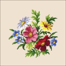 This 1868 pattern french pattern from the seller's collection is a nice arrangement of Wild Roses, Forget Me Nots and Coriopsis. Using 31 DMC colors, that closely match the original pattern, finished it is 85 stitches wide by 91 stitches tall.