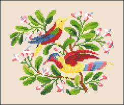 This late 1860's pattern originally comes from Liverpool England and features a Red Crested Bluebodied Foul amongst a bower of Pink Wild Roses. The design is 203 stitches wide by 203 stitches tall and is made up of 36 DMC colors.