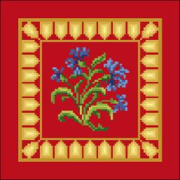 This 1870s French pin cushion pattern comes from the original pattern and matching finished work in the seller's collection. The finished work was done on a rich red background, so I have shown it as such but almost any color would look good. The flowers were done in beadwork, as was the tassle framework that surrounds the cornflowers, while the leaves were done in wool. Finishing it off was a one inch loop of white and clear beading. The design is 79 stitches wide by 79 stitches tall and is made of up 13 DMC colors.