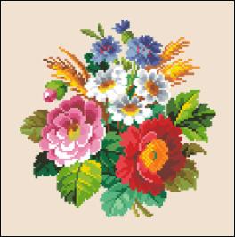 This 1840's pattern comes from the famed designers HERTZ & WEGENER in Berlin, design number 2230. The bouquet is a composite of comon and exotic flowers which makes a striking design. It is made up of 52 DMC colors, and is 269 stitches wide by 213 stitches tall.