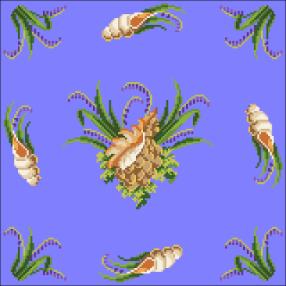This 1865 Conch Shell pattern comes from the seller's collection and was originally designed to have the shells done in beadwork with the balance of the pattern done in woolwork. The overall design is 156 stitches wide by 156 stitches tall with the central design being 84 stitches wide by 73 stitches tall and is comprised of 16 DMC colors that closely match the original design.