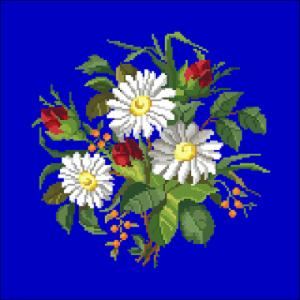 This 1870's pattern of a bouquet of Bachelor Buttons, comes from a finished work in th seller's collection. On the original design, the flowers were executed in silkwork, the flower centers in beadwork with the balance in wool. The design as shown is made up of 32 DMC colors and is 120 stitches wide by 117 stitches tall.