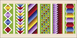This pattern is from a period magazine dated 1878. The pattern shows five different variations of the design using colors that were popular in that time period. Made up of five DMC colors each and each stripe is 27 stitches wide and can be made to any length.