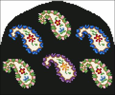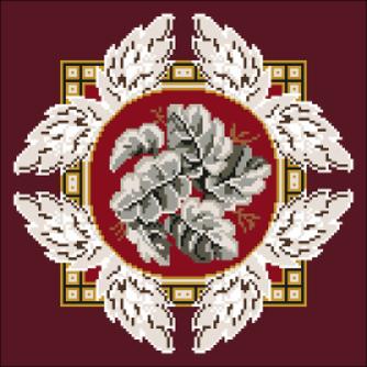 This 1860's pattern comes from a finished footstool that was lent to me by an elderly aunt. She received it from her aunt in her will. The background was a deep marroon color and there wasn't a bead loose or missing which made it easy to duplicate. Made up of 20 DMC colors the design is 109 stitches wide by 109 stitches tall.