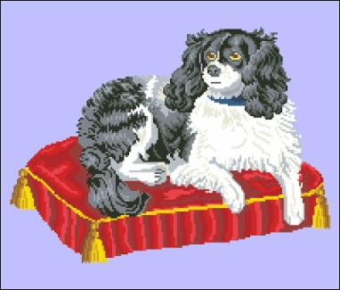 This 1860s pattern comes from a finished work in the seller's collection. The Victorian pointer, sat upon a small footstool, that like the needlework, was handmade. Made up of 14 DMC colors, it is 94 stitches wide and 79 stitches tall.