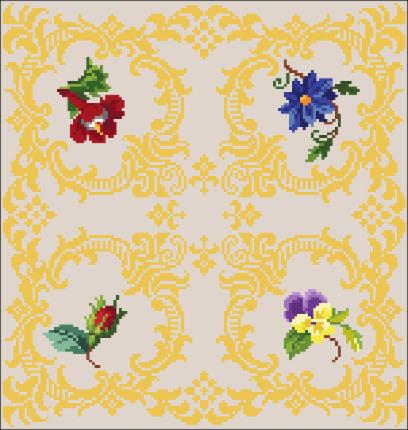 This pattern comes from a finished work and is circa 1880 and began life as a cushion cover from France. The design is made up of muted colors from years of exposure to sunlight. The background was a soft beige and is 162 stitches wide by 147 stitches tall and is made up of 35 DMC colors.