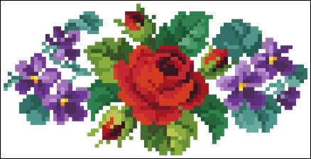This 1860's pattern comes from a finished work in the seller's colletion. The design was executed on a laticework background in shades of gold. I have eliminated that as it appeared to busy for today's taste and diminished the beauty of the design. Originally the Violets and the white Rose was done in beadwork which made them stand out. The pattern is made up of 47 DMC colors and is 160 stitches wide by 160 stitches tall. While the original work was never used, I presume it was desgined for a chairseat or cushion front.
