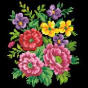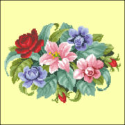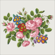 This pattern hails from the early 1850’s, as Mr. Wicht ceased operation in 1858. This design is small but it is packed tightly with lush leaves around two Roses and what appear to be Dogwood blossoms. The pattern is square at 90 stitches wide by 90 stitches tall but uses 36 DMC colors to complete the design.