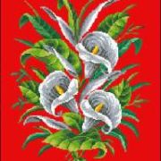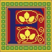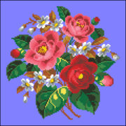 This 1869 pattern comes from England was originally designed to grace a tea cosey. The pattern called for the white portion of the fucshia’s to be executed in beadwork with the balance of the design to be done in wool. An alternate use given was a chairseat or cushion cover. The design is 104 stitches wide by 112 stitches tall and uses 22 DMC colors.